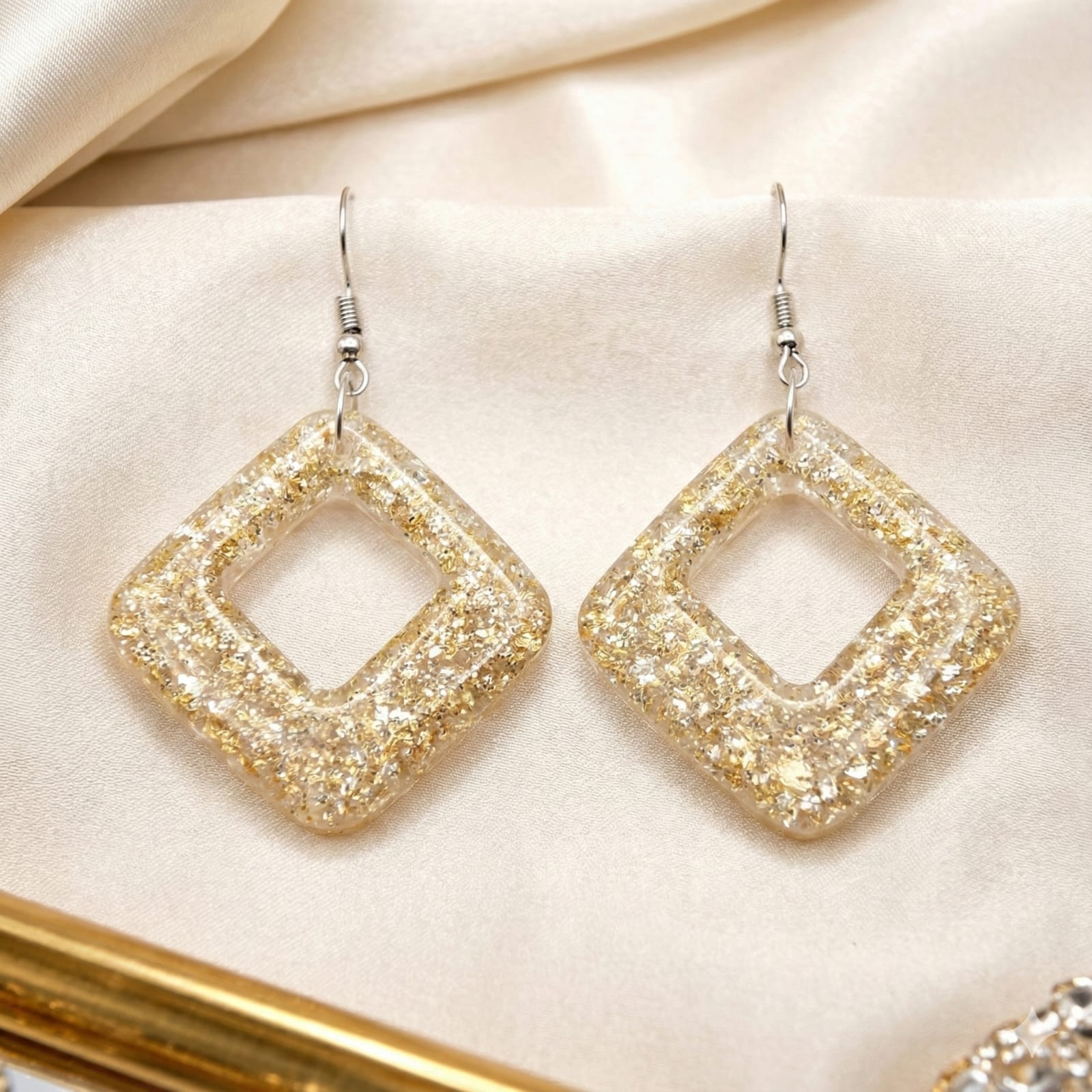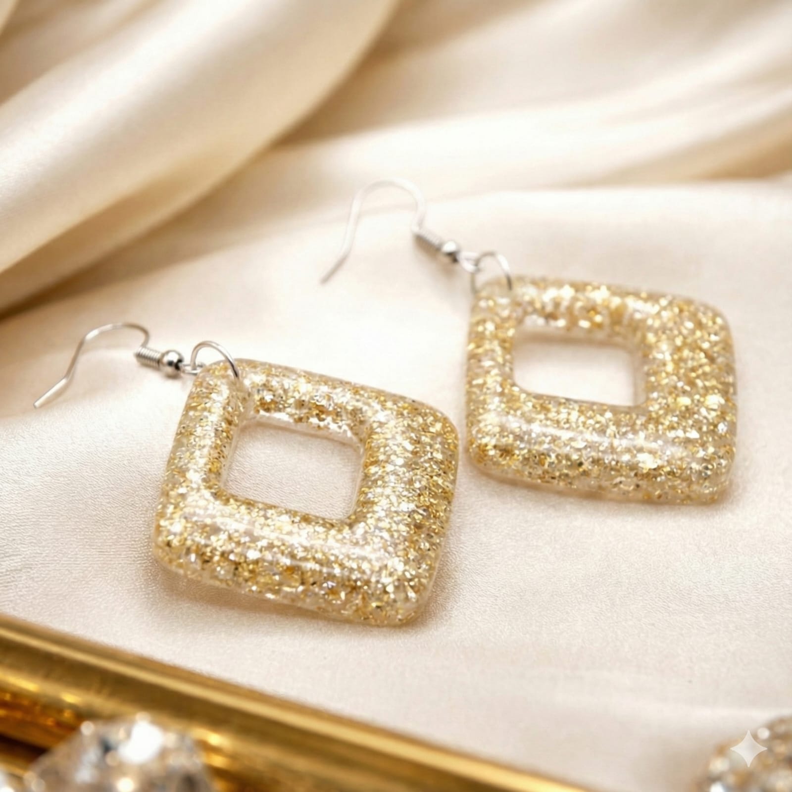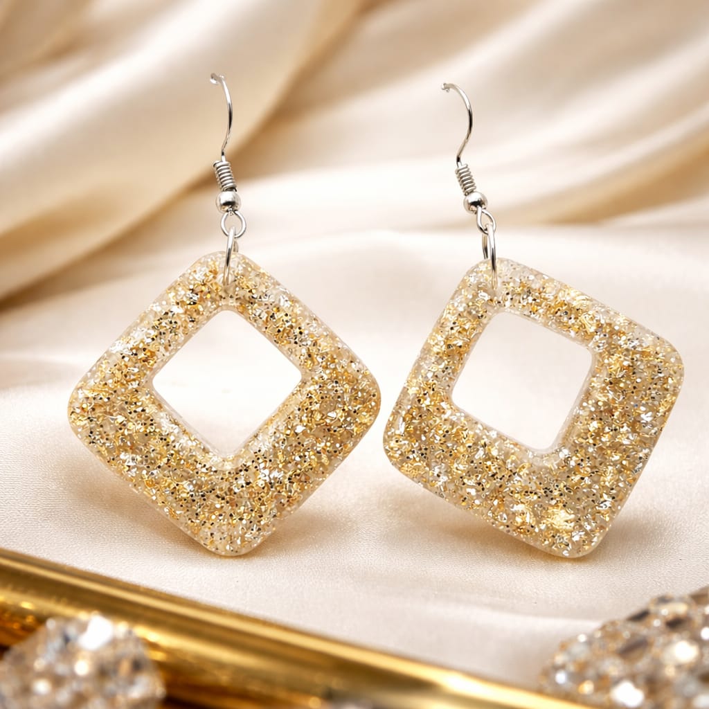 These handcrafted resin earrings feature a modern open-square geometric design, made with clear resin infused with gold-color shimmer/glitter for a subtle yet luxurious sparkle.