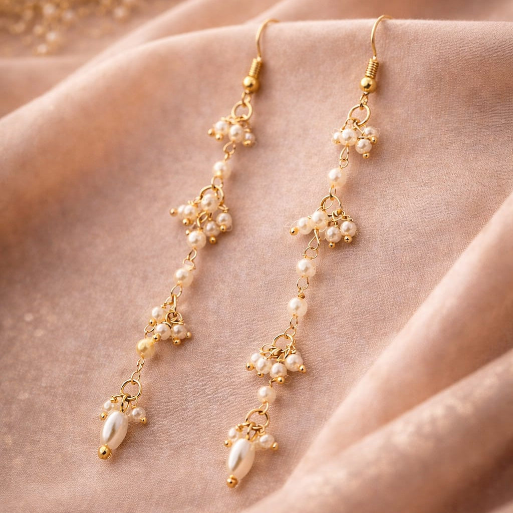 Handmade Pearl Cluster Long Drop Earrings | Minimal Elegant Gold Finish Jewelry