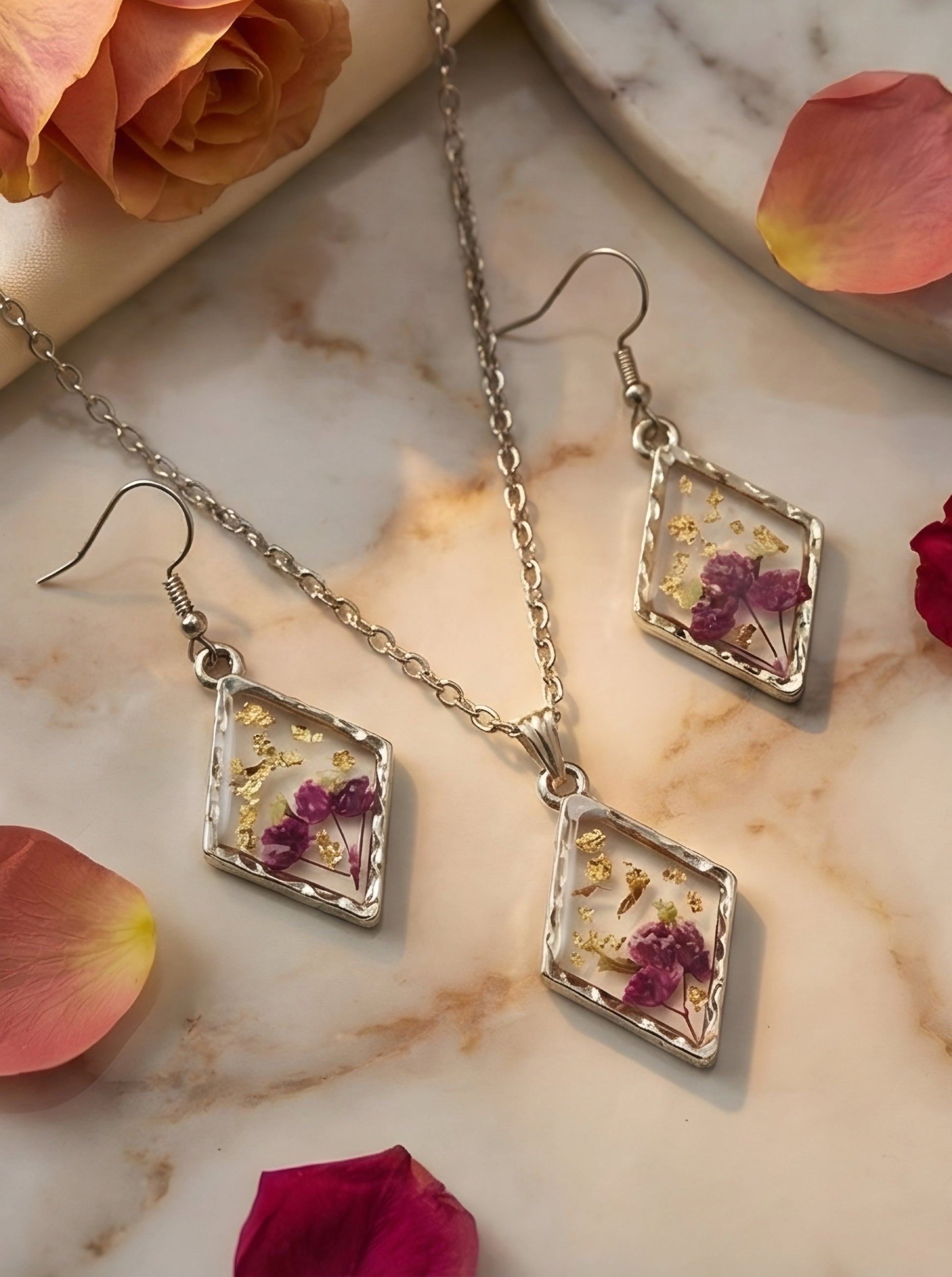 This handcrafted resin jewelry set features a beautiful square-shaped pendant necklace paired with matching drop earrings, made using real original flowers delicately preserved in crystal-clear resin and highlighted with gold foil flakes.