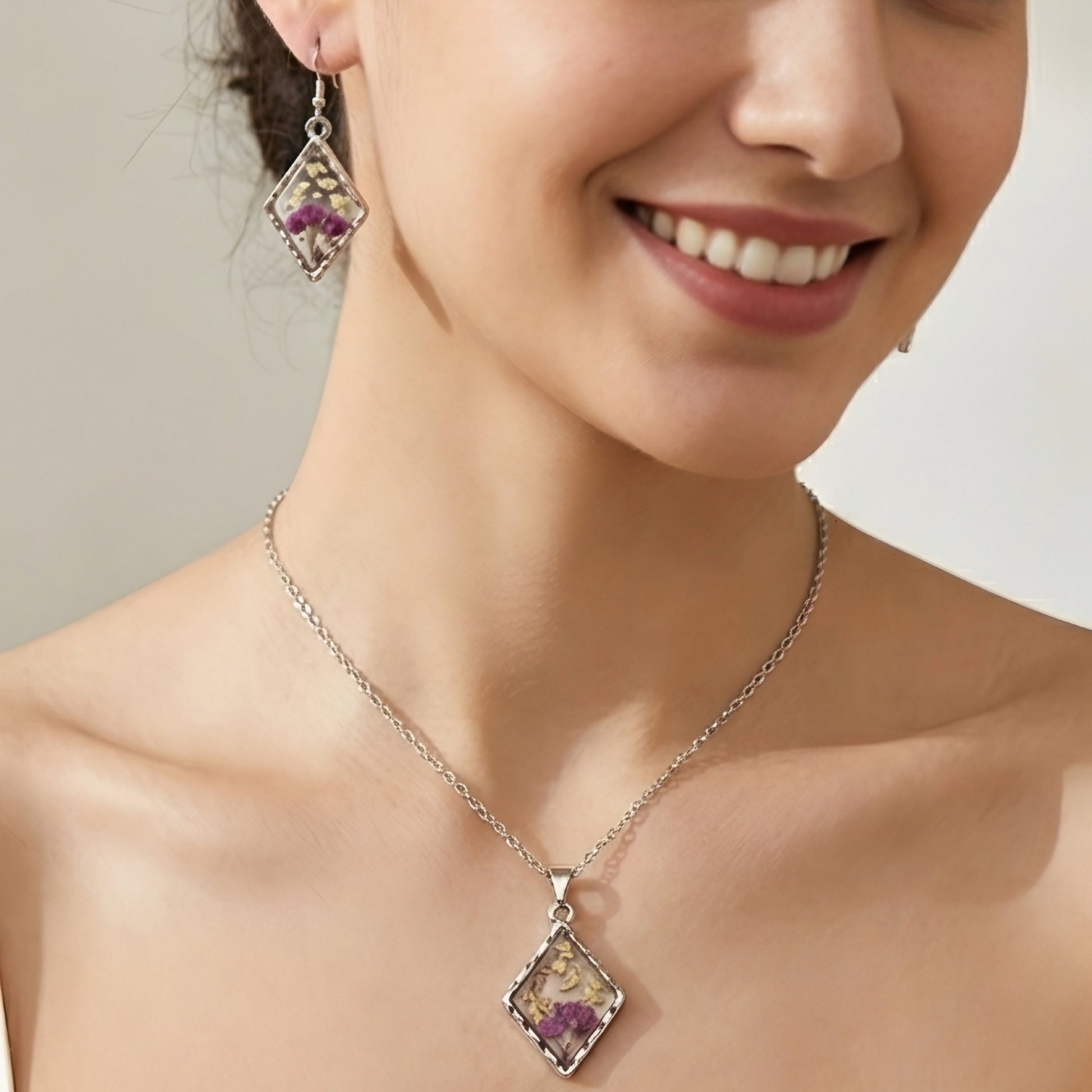 Real Flower Resin Pendant Necklace with Matching Earrings | Handmade Jewelry Set